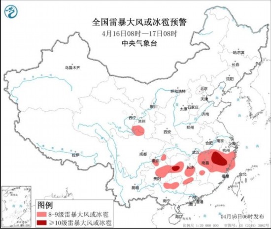 全國雷暴大風(fēng)或冰雹預(yù)警圖(4月16日08時-17日08時)