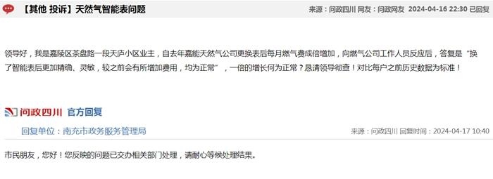 中新網(wǎng)4月17日電(中新財經(jīng)記者 吳濤)近日,在“問政四川”平臺上,不少網(wǎng)友反映“更換新表后燃?xì)赓M(fèi)異常上漲”,這些留言顯示來自四川成都、自貢、廣安、南充等多地,僅僅在4月16日,保守估計就有十幾條;17日上午又出現(xiàn)十幾條。大部分尚未得到回復(fù),部分獲得官方回復(fù)稱“留言已轉(zhuǎn)交給相關(guān)機(jī)構(gòu)進(jìn)行處理”。