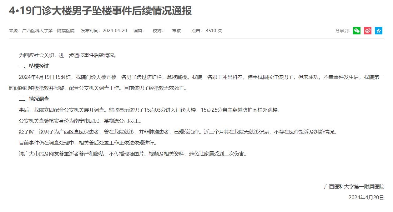 央視網(wǎng)消息:據(jù)廣西醫(yī)科大學(xué)第一附屬醫(yī)院網(wǎng)站消息,4月20日,廣西醫(yī)科大學(xué)第一附屬醫(yī)院發(fā)布《4·19門(mén)診大樓男子墜樓事件后續(xù)情況通報(bào)》。全文如下: