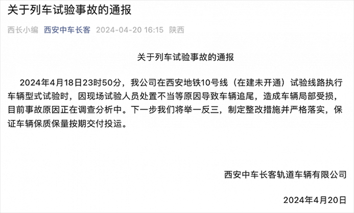 央視網(wǎng)消息:據(jù)西安中車長客官微消息,西安中車長客軌道車輛有限公司4月20日通報,4月18日23時50分,公司在西安地鐵10號線(在建未開通)試驗線路執(zhí)行車輛型式試驗時,因現(xiàn)場試驗人員處置不當(dāng)?shù)仍驅(qū)е萝囕v追尾,造成車輛局部受損,目前事故原因正在調(diào)查分析中。下一步將舉一反三,制定整改措施并嚴(yán)格落實,保證車輛保質(zhì)保量按期交付投運(yùn)。
