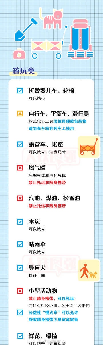 坐火車出游的小伙伴請(qǐng)注意!有些物品過不了安檢,出發(fā)前趕快篩查行李單,隨手轉(zhuǎn)發(fā)?、侔b密封完好、標(biāo)志清晰且酒精體積百分含量大于或者等于24%、小于或者等于70%的酒類飲品累計(jì)不超過3000毫升。②充電寶標(biāo)志清晰,單塊額定能量不超過100Wh。③自噴壓力容器,單體容器容積不超過150毫升,每種限帶1件,累計(jì)不超過600毫升。④含易燃成分的非自噴壓力容器日用品,單體容器容積不超過100毫升,每種限帶1件。