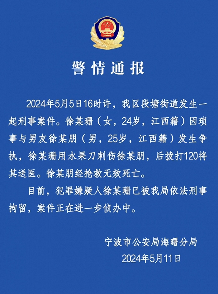 央視網(wǎng)消息:5月11日,寧波市公安局海曙分局發(fā)布警情通報,5月5日16時許,海曙區(qū)段塘街道發(fā)生一起刑事案件。徐某珊(女,24歲,江西籍)因瑣事與男友徐某朋(男,25歲,江西籍)發(fā)生爭執(zhí),徐某珊用水果刀刺傷徐某朋,后撥打120將其送醫(yī)。徐某朋經(jīng)搶救無效死亡。目前,犯罪嫌疑人徐某珊已被海曙分局依法刑事拘留,案件正在進(jìn)一步偵辦中。