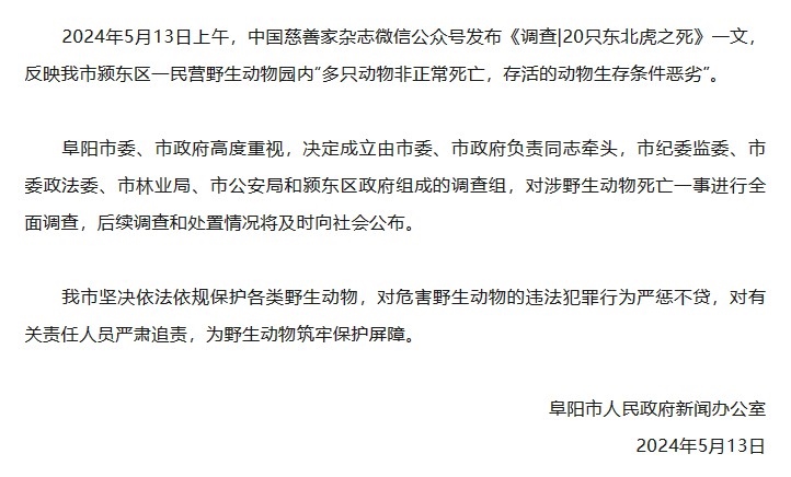 央視網(wǎng)消息:據(jù)“阜陽發(fā)布”微信公眾號消息,阜陽市人民政府新聞辦公室發(fā)布情況通報,2024年5月13日上午,中國慈善家雜志微信公眾號發(fā)布《調查|20只東北虎之死》一文,反映阜陽市潁東區(qū)一民營野生動物園內“多只動物非正常死亡,存活的動物生存條件惡劣”。