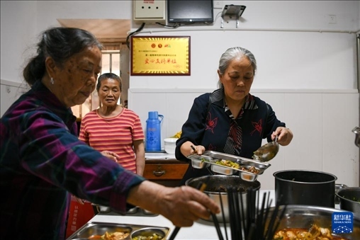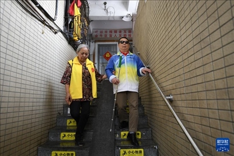 4月15日,馮懿蘋(右)與成都視障者互助協(xié)會(huì)家屬志愿者為樂隊(duì)成員準(zhǔn)備午飯。新華社記者 胥冰潔 攝