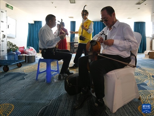 5月13日,“自強(qiáng)不息藝術(shù)團(tuán)盲人樂隊(duì)”成員準(zhǔn)備登臺(tái)演出。新華社記者 胥冰潔 攝
