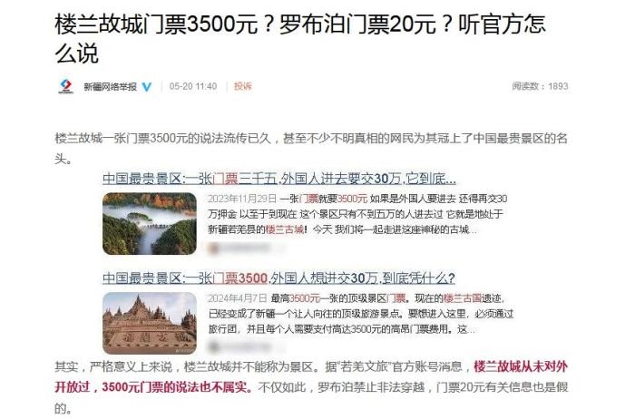 文章稱(chēng), ?樓蘭故城一張門(mén)票3500元的說(shuō)法流傳已久,甚至不少不明真相的網(wǎng)民為其冠上了中國(guó)最貴景區(qū)的名頭。其實(shí),嚴(yán)格意義上來(lái)說(shuō),樓蘭故城并不能稱(chēng)為景區(qū)。據(jù)“若羌文旅”官方賬號(hào)消息,樓蘭故城從未對(duì)外開(kāi)放過(guò),3500元門(mén)票的說(shuō)法也不屬實(shí)。不僅如此,羅布泊禁止非法穿越,門(mén)票20元有關(guān)信息也是假的。