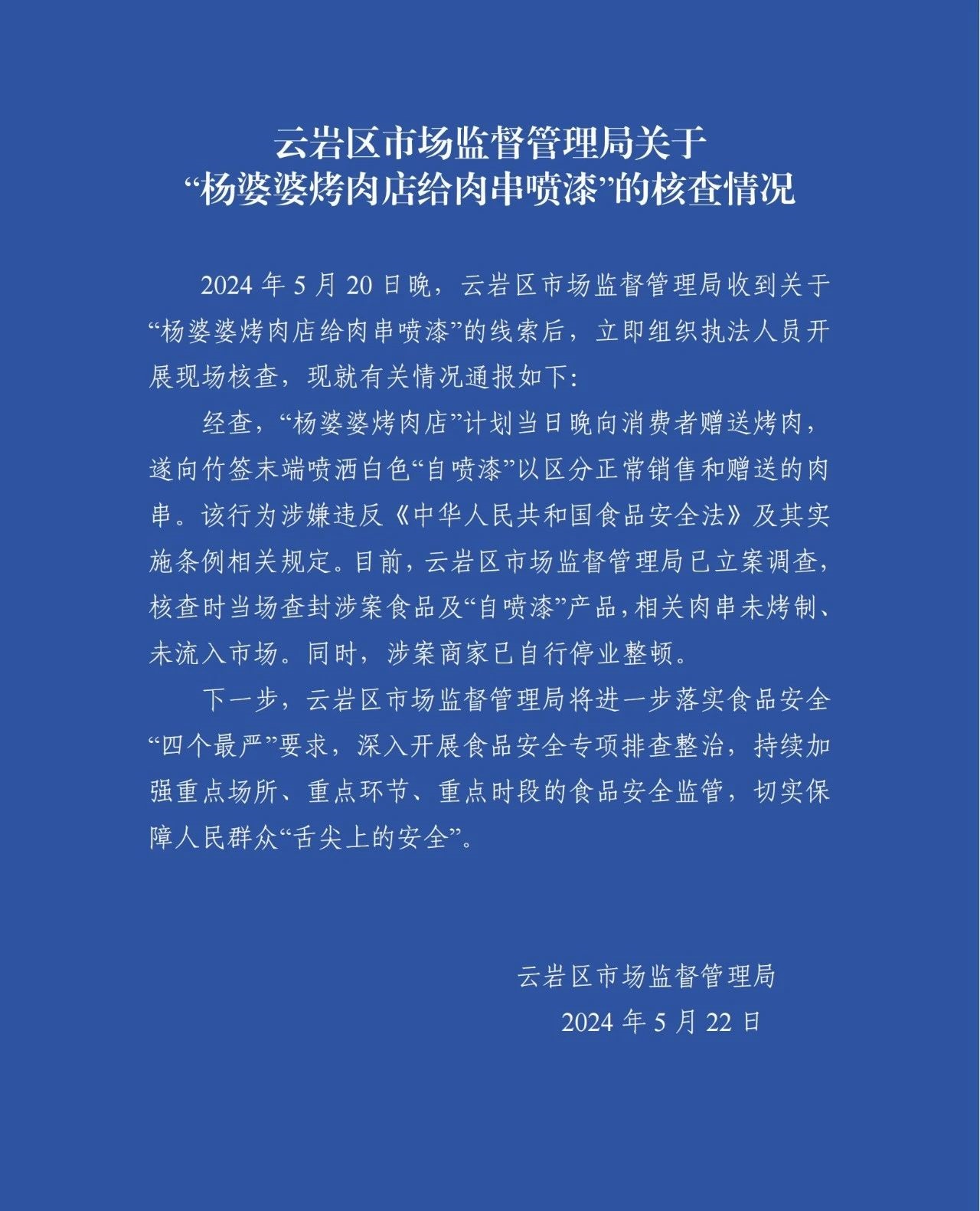 央視網(wǎng)消息:5月22日,貴陽市云巖區(qū)市場監(jiān)管局官方微信公眾號(hào)發(fā)布關(guān)于“楊婆婆烤肉店給肉串噴漆”的核查情況。經(jīng)查,“楊婆婆烤肉店”計(jì)劃當(dāng)日晚向消費(fèi)者贈(zèng)送烤肉,遂向竹簽?zāi)┒藝娋瓢咨白試娖帷币詤^(qū)分正常銷售和贈(zèng)送的肉串。該行為涉嫌違反《中華人民共和國食品安全法》及其實(shí)施條例相關(guān)規(guī)定。目前,云巖區(qū)市場監(jiān)督管理局已立案調(diào)查,核查時(shí)當(dāng)場查封涉案食品及“自噴漆”產(chǎn)品,相關(guān)肉串末烤制、未流入市場。同時(shí),涉案商家已自行停業(yè)整頓。