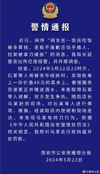 ·網(wǎng)友稱(chēng)在飯店吃飯被多算錢(qián)還遭威脅,西安雁塔警方通報(bào)。
