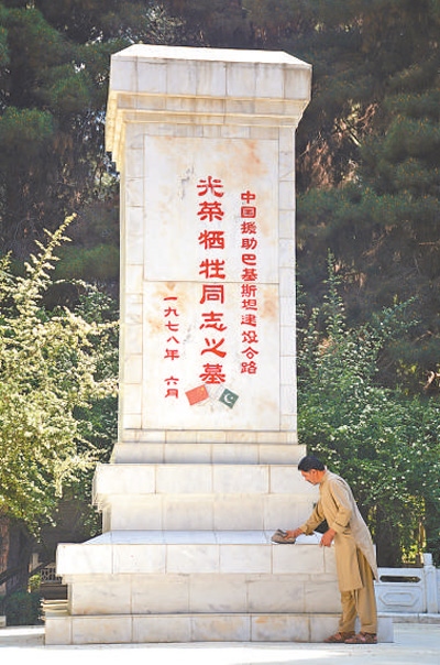 巴基斯坦北部城市吉爾吉特東郊的丹沃爾村有一座中國(guó)烈士陵園。1966年至1978年,中國(guó)援助巴基斯坦修建喀喇昆侖公路。12年間,數(shù)百名中國(guó)工程技術(shù)人員獻(xiàn)出了生命,其中88人安葬在此。從1978年起,艾哈邁德和父親在這里守陵,每天打掃陵園。圖為艾哈邁德在擦拭紀(jì)念碑。本報(bào)巴基斯坦分社 賽義德·邁赫迪攝