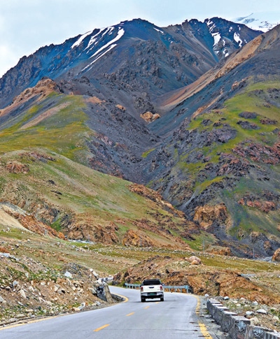 喀喇昆侖公路穿越巍峨險(xiǎn)峻的喀喇昆侖山脈,大量路段位于高寒山地,地質(zhì)條件復(fù)雜,修建橋梁和隧道的工程難度大、危險(xiǎn)性高。公路沿線有多處巴方設(shè)立的紀(jì)念地標(biāo),傳承兩國(guó)友誼。圖為一輛汽車(chē)行駛在喀喇昆侖公路上。本報(bào)巴基斯坦分社 賽義德·邁赫迪攝