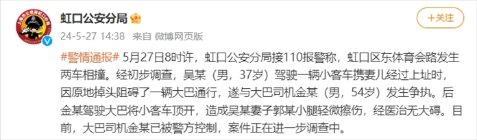 央視網(wǎng)消息:上海市公安局虹口分局發(fā)布警情通報(bào),5月27日8時(shí)許,虹口公安分局接110報(bào)警稱,虹口區(qū)東體育會(huì)路發(fā)生兩車相撞。經(jīng)初步調(diào)查,吳某(男,37歲)駕駛一輛小客車攜妻兒經(jīng)過上址時(shí),因原地掉頭阻礙了一輛大巴通行,遂與大巴司機(jī)金某(男,54歲)發(fā)生爭執(zhí)。后金某駕駛大巴將小客車頂開,造成吳某妻子郭某小腿輕微擦傷,經(jīng)醫(yī)治無大礙。目前,大巴司機(jī)金某已被警方控制,案件正在進(jìn)一步調(diào)查中。