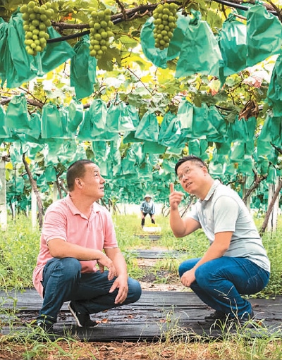 陳李波(右)在崇賢村葡萄種植園與農戶一起察看葡萄長勢。錢麗君攝