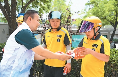 6月11日,北京市海淀區(qū)北太平莊街道總工會(huì)工作人員(左)為外賣配送員送上飲料及扇子。當(dāng)日,北京迎來(lái)高溫天氣,許多戶外勞動(dòng)者堅(jiān)守崗位,保障公共服務(wù)運(yùn)行。 新華社記者 任 超攝