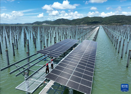 6月20日,施工人員在海上光伏電站現(xiàn)場(chǎng)安裝支架和光伏組件。