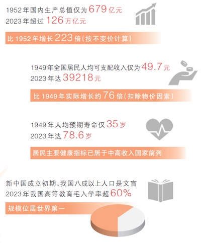 各行各業(yè)的發(fā)展成就,人民生活的蒸蒸日上,濃縮在一組組數(shù)據(jù)中。與新中國成立初期相比,2023年國內(nèi)生產(chǎn)總值增長223倍、人均GDP增長89倍、人均預(yù)期壽命提高43.6歲、農(nóng)村貧困人口全部脫貧……國家統(tǒng)計局近日發(fā)布新中國成立75年經(jīng)濟(jì)社會發(fā)展成就系列報告,“數(shù)”說75年偉大成就,本版“大數(shù)據(jù)觀察”欄目推出特別報道,記錄同心同德、艱苦奮斗的奮進(jìn)歷程,匯聚共襄強國建設(shè)、民族復(fù)興偉業(yè)的磅礴力量。