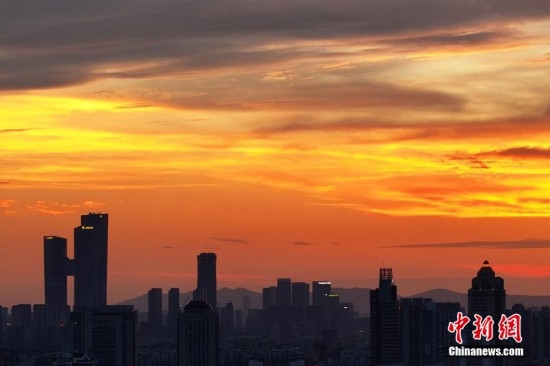 7月7日傍晚,南京上空漫天紅霞。近日,當(dāng)?shù)爻掷m(xù)高溫,同時“蒸”出晴好天氣。(無人機照片)