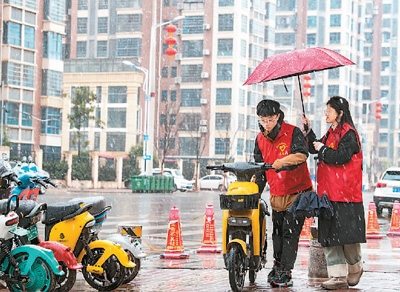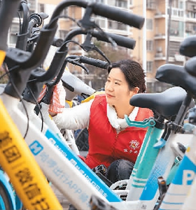 江西贛州興國(guó)縣長(zhǎng)征社區(qū)志愿者在街頭整理共享單車。陳 鵬攝(人民視覺(jué))