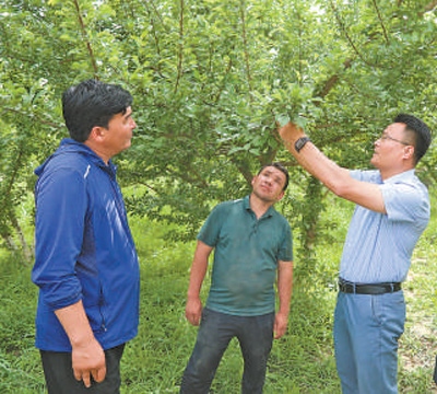 徐學(xué)彬(右一)與種植戶查看果樹掛果情況。塔依爾·艾力攝