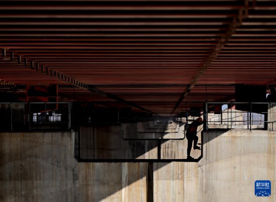 1月17日,橋梁工在檢查鄭焦城際鐵路黃河大橋梁體。
