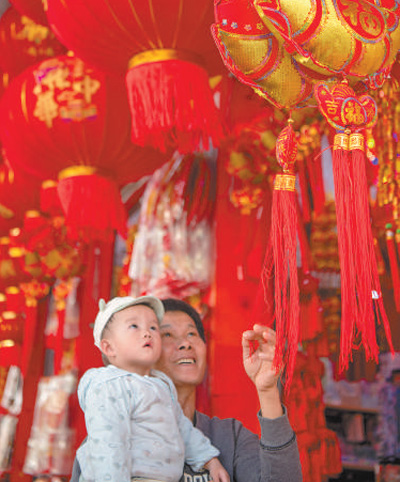 海南瓊海市民在商店選購過年飾品。