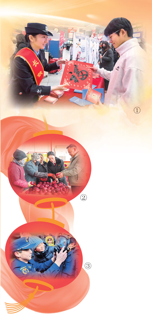 圖①:在吉林長春,鐵路公安民警為旅客送“福”字。