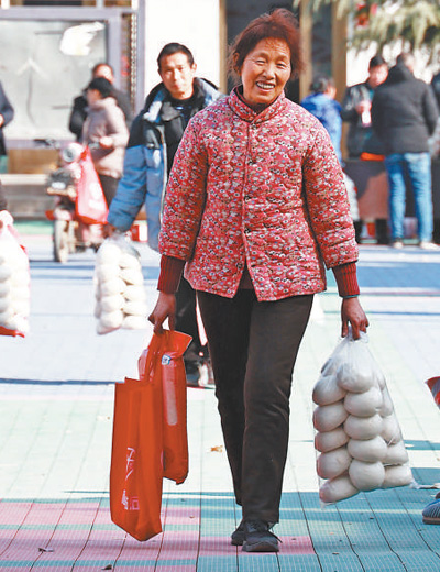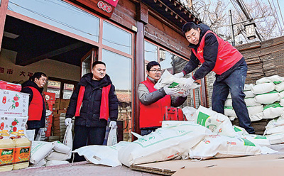 山東省青州市,工作人員將走訪慰問(wèn)困難群眾的愛(ài)心年貨裝車。