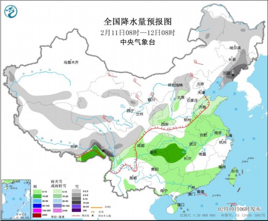全國降水量預(yù)報(bào)圖(2月10日08時(shí)-11日08時(shí)) 圖片來源:中央氣象臺(tái)網(wǎng)站