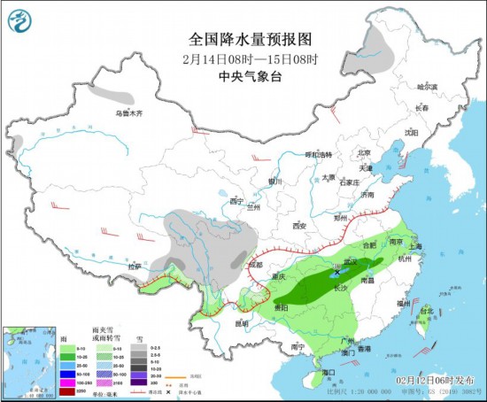 2月14日08時至15日08時,內(nèi)蒙古東北部、新疆沿天山地區(qū)、西藏東部、川西高原、云南北部等地的部分地區(qū)有小雪或雨夾雪,其中,西藏東部、川西高原東部等地部分地區(qū)有中雪。貴州、重慶南部、湖北南部、湖南、江西北部、安徽南部、浙江北部、江蘇南部、廣西東部和北部、廣東中西部、海南島東部、臺灣島等地的部分地區(qū)有小到中雨,其中,湖北南部、湖南北部等地局地有大雨(25~30毫米)。內(nèi)蒙古中西部、西藏北部和西部、甘肅河西等地部分地區(qū)有4~6級風(fēng);臺灣海峽、巴士海峽、南海北部等海域有6~7級風(fēng)。