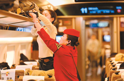 近日,G894次列車長張慧在客流高峰期加密車廂巡查頻次,動態(tài)做好行李架整理。
