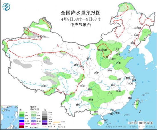 4月8日08時至9日08時,新疆北部、內(nèi)蒙古中東部、西藏北部、青海南部等地有小到中雪或雨夾雪,內(nèi)蒙古中部、陜西北部、山西、河北北部和南部、山東、貴州東部和南部、湖南中南部、江西中部、廣西中北部、海南島、臺灣島等地有小到中雨。內(nèi)蒙古大部、甘肅河西、陜西中北部、山西等地部分地區(qū)有4~6級風(fēng),陣風(fēng)7級。