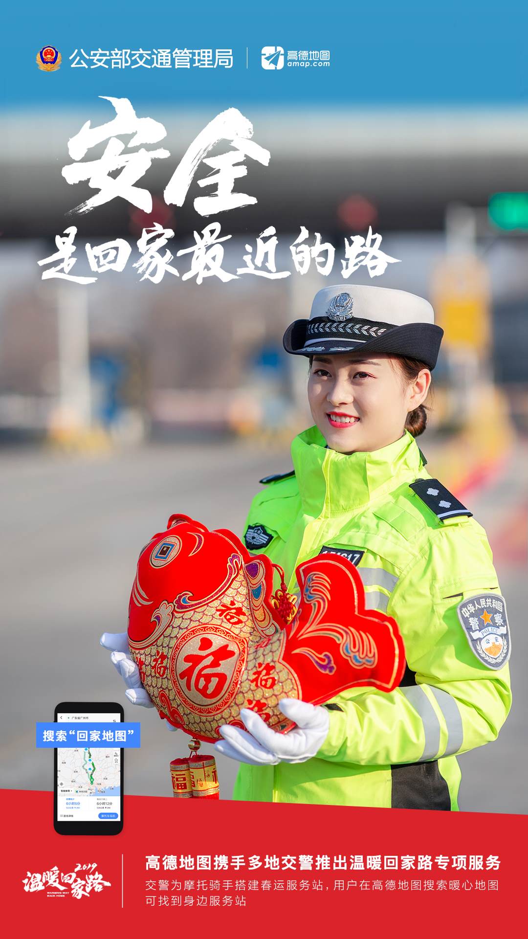 為做好2019年春運保障工作,特別是發(fā)動社會力量做好交通安全社會協(xié)同治理,廣東、廣西、福建、江西、湖北、云南、安徽、四川、湖南等春運重點省、自治區(qū)交警總隊聯(lián)合高德地圖啟動2019年春運“溫暖回家路”專項,推出“回家地圖”系列在線服務(wù),通過“交警+科技”結(jié)合,助力人民群眾安全返鄉(xiāng)。同時,與人民日報社、新華社、中央廣播電視總臺等媒體,以及中廣聯(lián)合會、中國交通頻道等機構(gòu)和微博、秒拍、一直播等新媒體平臺聯(lián)動,共同開展2019年春運交通安全宣傳工作。