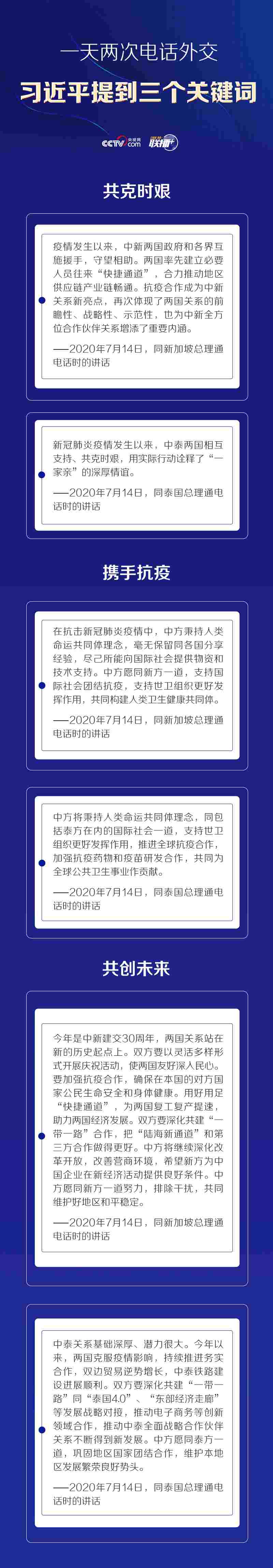 聯(lián)播+當前,新冠肺炎疫情仍在全球蔓延,多國面臨外防輸入、內(nèi)防反彈的壓力。7月14日,習近平主席分別同新加坡總理李顯龍和泰國總理巴育通電話。