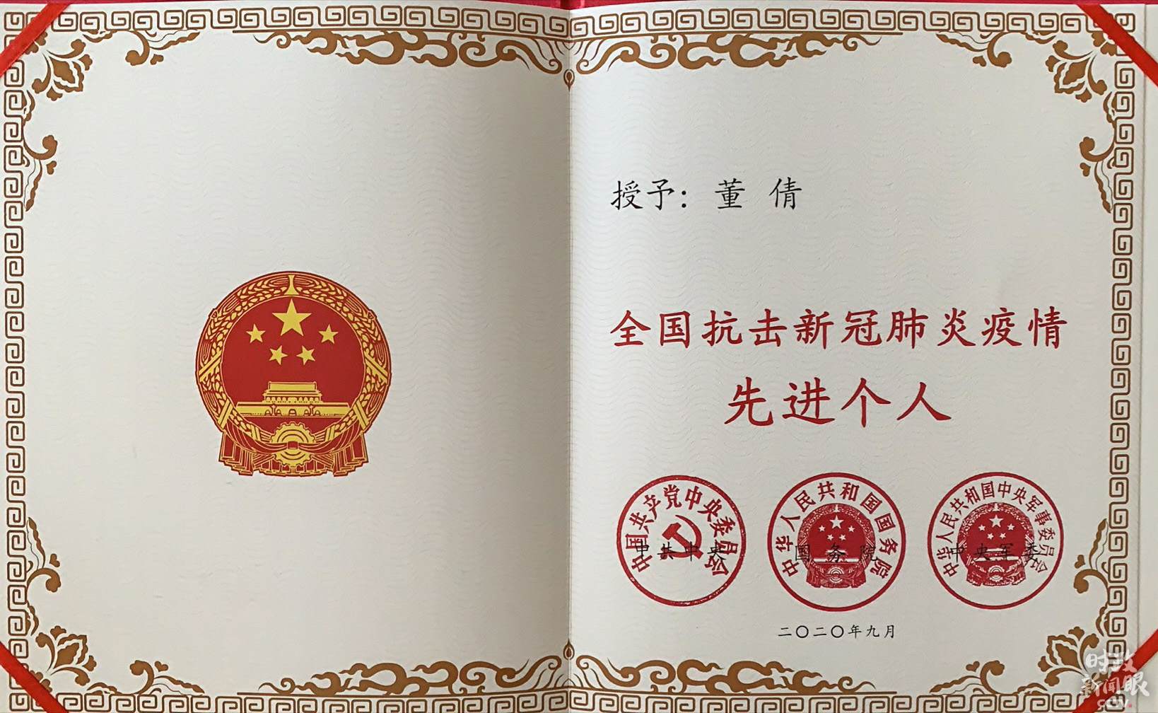 △全國抗擊新冠肺炎疫情先進個人獎?wù)潞妥C書。(總臺央視記者張淳拍攝)