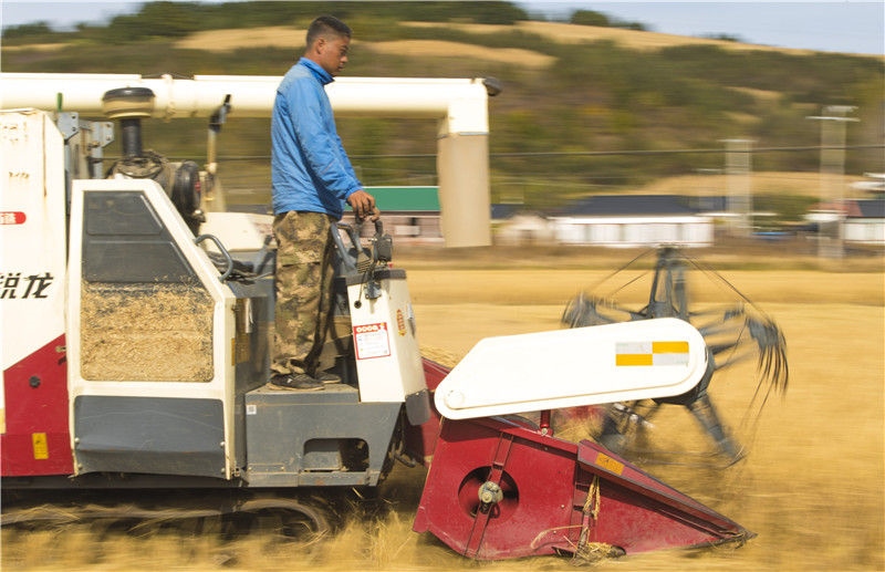 在吉林省延邊州和龍市光東村稻田里,農(nóng)民駕駛收割機(jī)收獲成熟的水稻(2019年10月10日攝)。新華社記者許暢攝