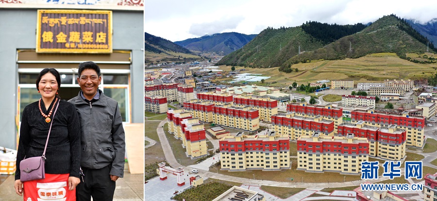 2020年9月22日拍攝的拼版照片:左圖為西藏自治區(qū)昌都市類烏齊縣長(zhǎng)毛嶺鄉(xiāng)達(dá)雄村村民俄金(右)和妻子阿丁在安置點(diǎn)俄金蔬菜店前;右圖為類烏齊縣桑多扶貧開(kāi)發(fā)區(qū)易地扶貧搬遷安置點(diǎn)一角(無(wú)人機(jī)照片)。新華社記者詹彥攝