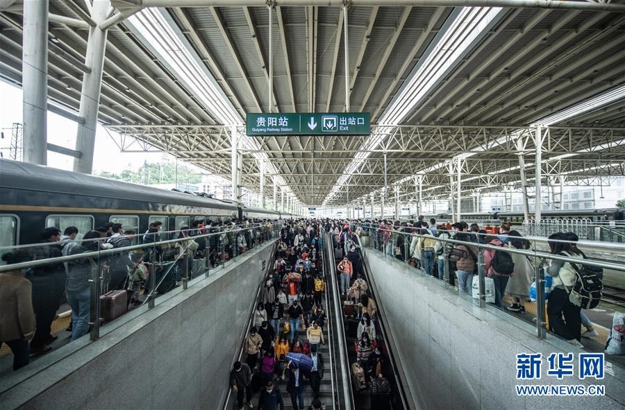 10月7日,長假臨近尾聲,貴陽火車站迎來旅客返程高峰。這是旅客在貴陽火車站準備出站。新華社記者陶亮攝