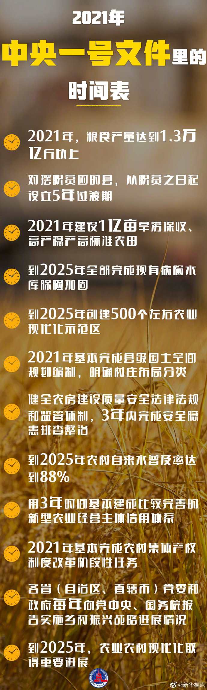 2021年糧食產量達到1.3萬億斤以上、2021年建設1億畝高標準農田、到2025年農村自來水普及率達到88%……今年中央一號文件仍聚焦“三農”,對多方面工作作出詳細部署,明確了時間表。一起了解下↓