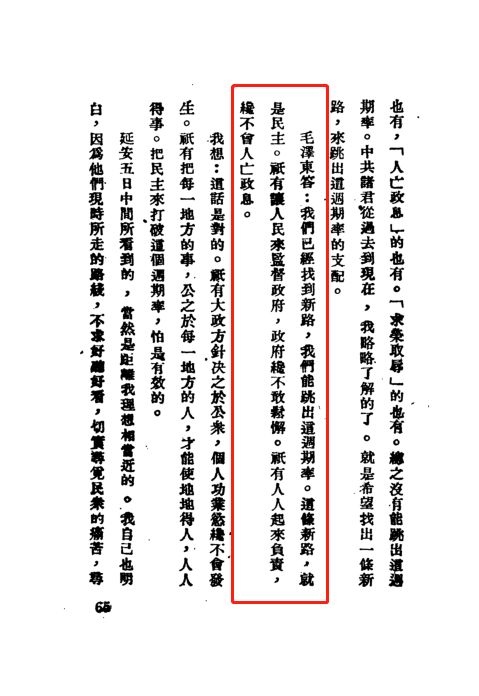 毛澤東同志的回答干脆果斷:“我們已經(jīng)找到新路,我們能跳出這周期率。這條新路,就是民主。只有讓人民來監(jiān)督政府,政府才不敢松懈。只有人人起來負責,才不會人亡政息。”
