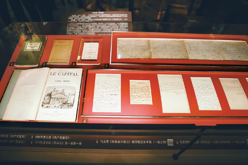 中國共產(chǎn)黨歷史展覽館的展廳里,陳列著多份珍貴的馬克思手稿。右上為馬克思《布魯塞爾筆記》第四筆記本手稿;右下為馬克思寫給《資本論》法文版出版人的六封書信?!≈行律绨l(fā) 陳曉根/攝