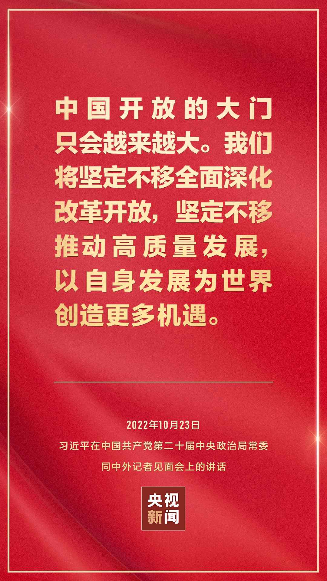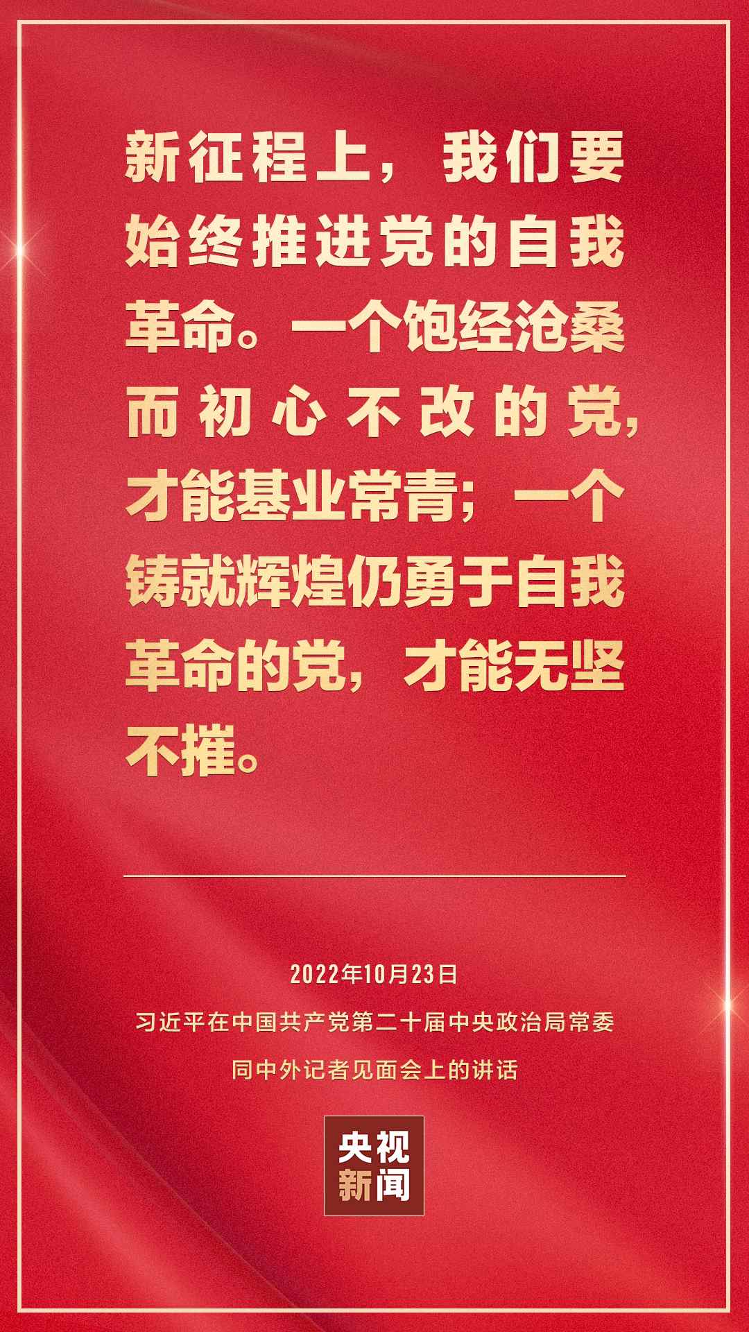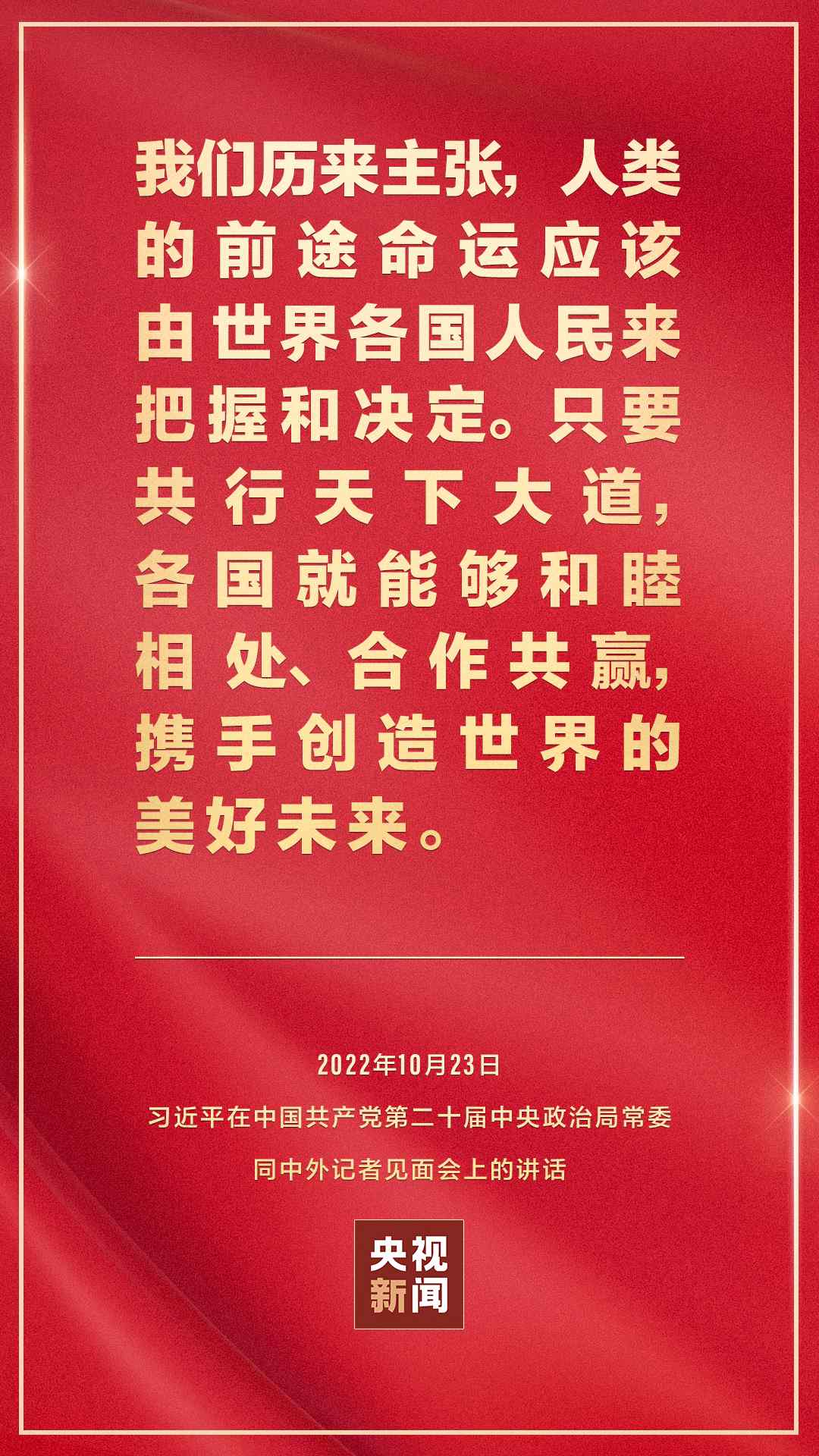 在中國(guó)共產(chǎn)黨第二十屆中央委員會(huì)第一次全體會(huì)議上當(dāng)選的中共中央總書(shū)記習(xí)近平和中共中央政治局常委李強(qiáng)、趙樂(lè)際、王滬寧、蔡奇、丁薛祥、李希,23日中午在人民大會(huì)堂同采訪中共二十大的中外記者見(jiàn)面。習(xí)近平發(fā)表重要講話。