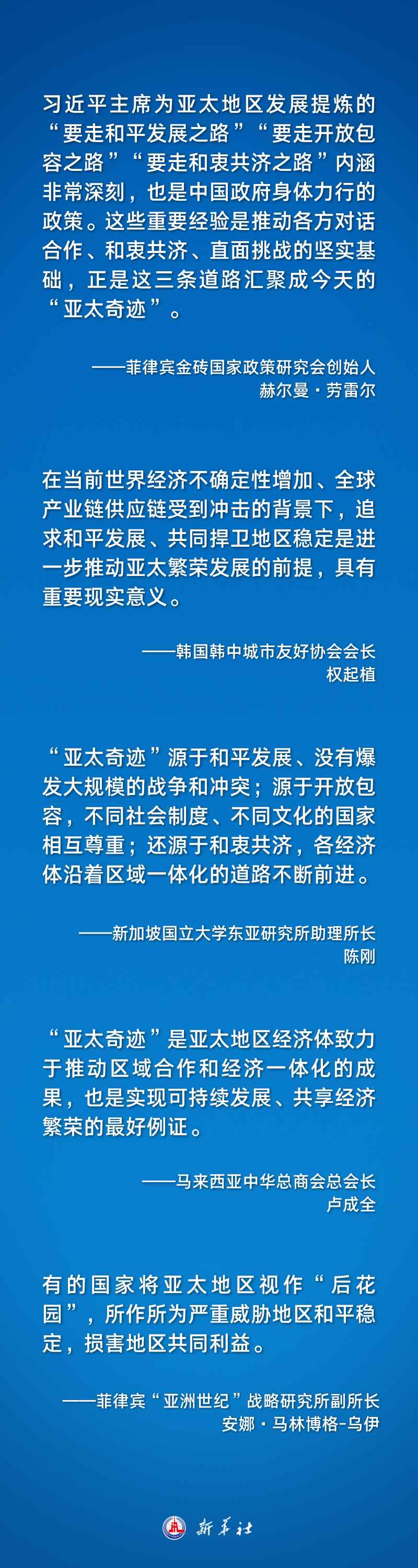 對(duì)于亞太未來(lái)發(fā)展繁榮,習(xí)近平主席提出重要主張:要攜手構(gòu)建亞太命運(yùn)共同體,再創(chuàng)亞太合作新輝煌。多國(guó)人士認(rèn)為,“維護(hù)國(guó)際公平正義,建設(shè)和平穩(wěn)定的亞太”“堅(jiān)持開放包容,建設(shè)共同富裕的亞太”“堅(jiān)持綠色低碳發(fā)展,建設(shè)清潔美麗的亞太”“堅(jiān)持命運(yùn)與共,建設(shè)守望相助的亞太”為亞太地區(qū)未來(lái)發(fā)展指明了方向和路徑。