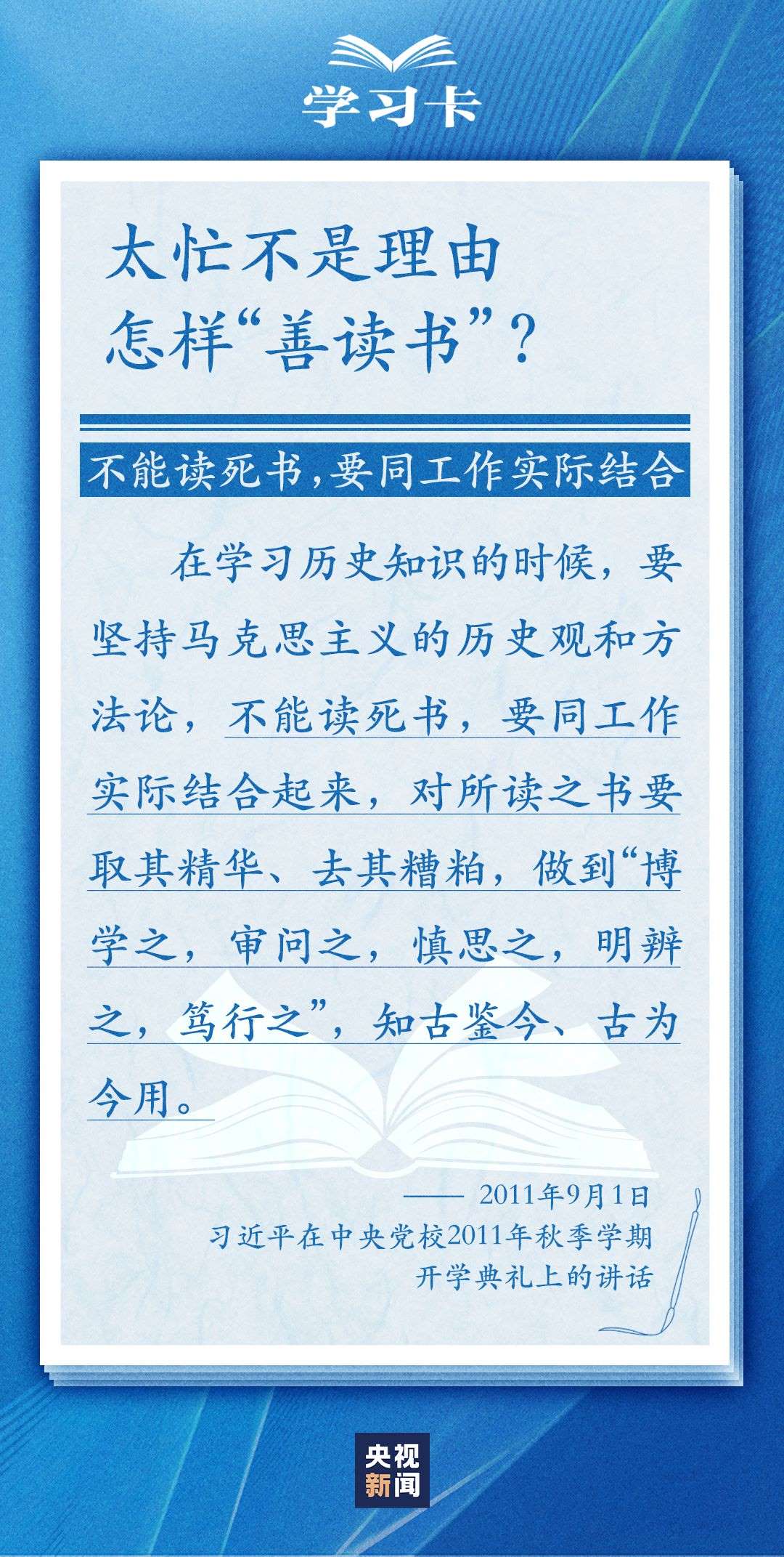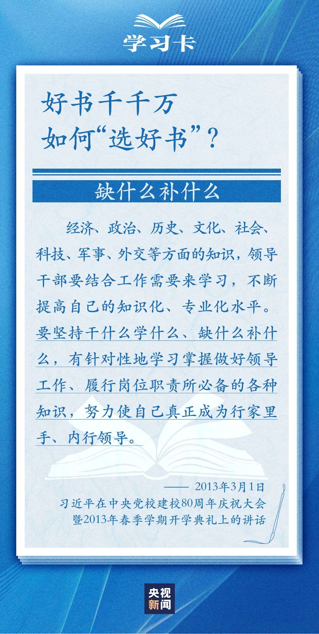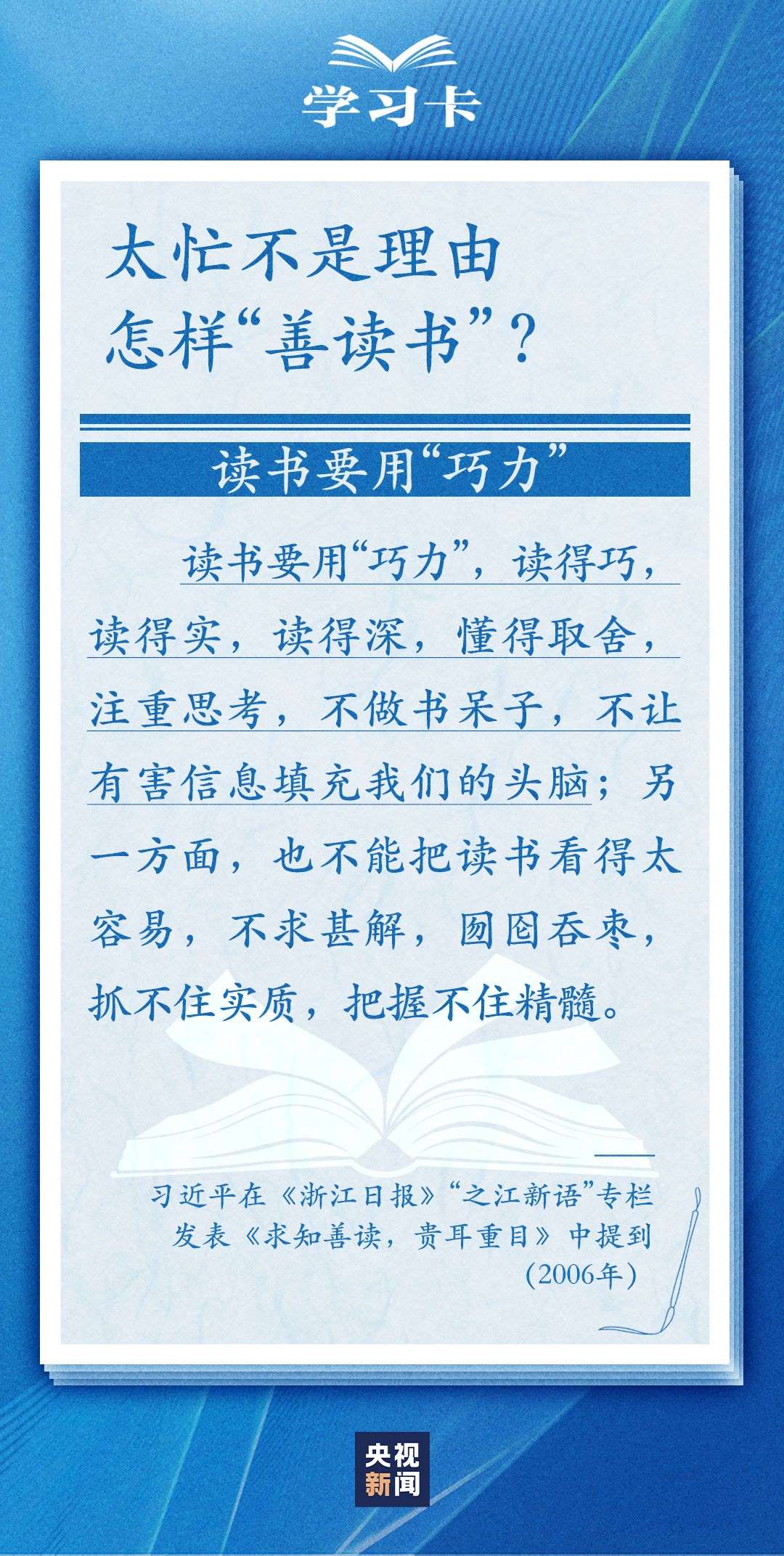 今天(4月23日)是世界讀書(shū)日。習(xí)近平曾多次講述和書(shū)籍的不解之緣,分享讀書(shū)學(xué)習(xí)的感悟,倡導(dǎo)“愛(ài)讀書(shū)、讀好書(shū)、善讀書(shū)”。書(shū)的魅力何在,為何要“愛(ài)讀書(shū)”?如何能“選好書(shū)”?怎樣“善讀書(shū)”?一起學(xué)習(xí)↓