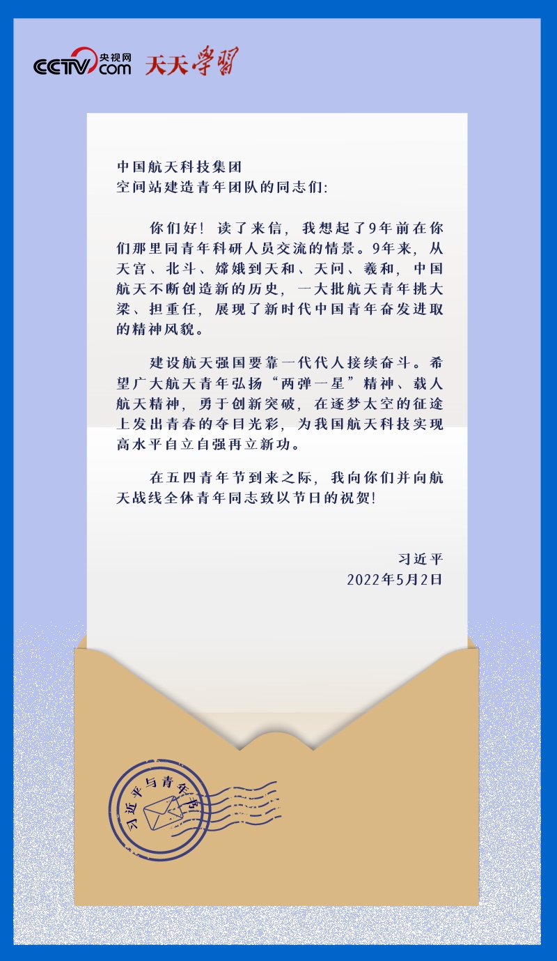 2022年5月2日,在五四青年節(jié)到來之際,中國航天科技集團空間站建造青年團隊收到了一份特別的節(jié)日禮物——一封落款為“習近平”的回信。