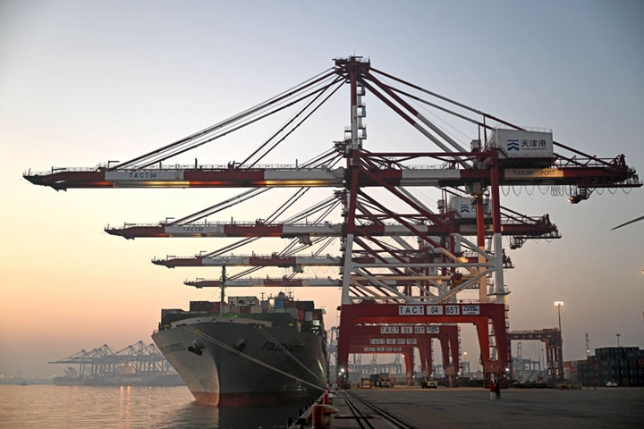 一艘貨輪靠泊在天津港聯(lián)盟國(guó)際集裝箱碼頭進(jìn)行裝卸作業(yè)(2023年1月1日攝)。新華社記者 趙子碩 攝