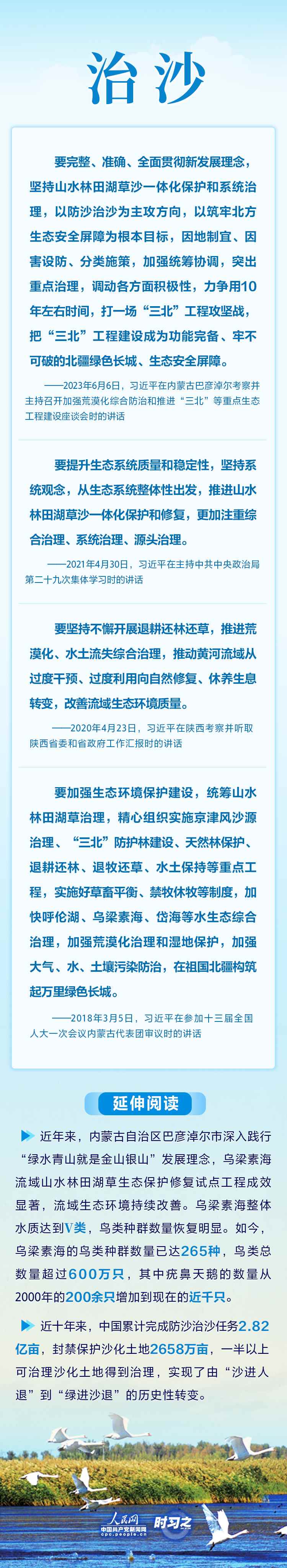 2023年6月5日至6日,中共中央總書記、國(guó)家主席、中央軍委主席習(xí)近平在內(nèi)蒙古自治區(qū)巴彥淖爾市考察,主持召開加強(qiáng)荒漠化綜合防治和推進(jìn)“三北”等重點(diǎn)生態(tài)工程建設(shè)座談會(huì)并發(fā)表重要講話。