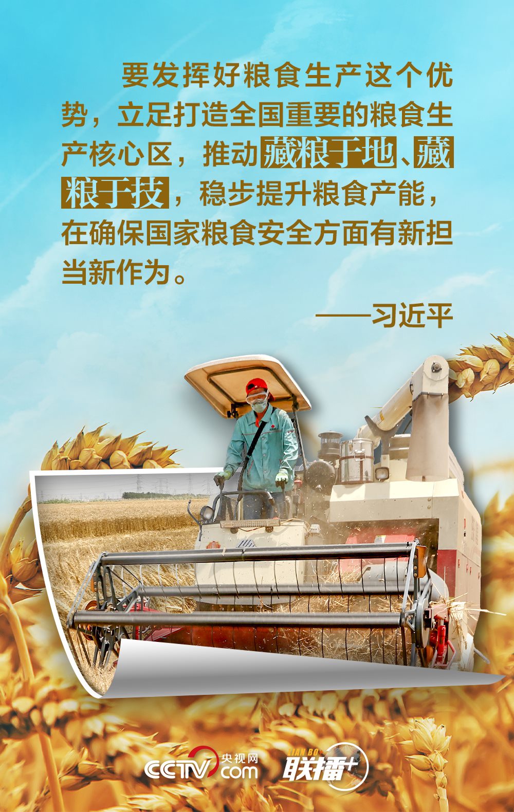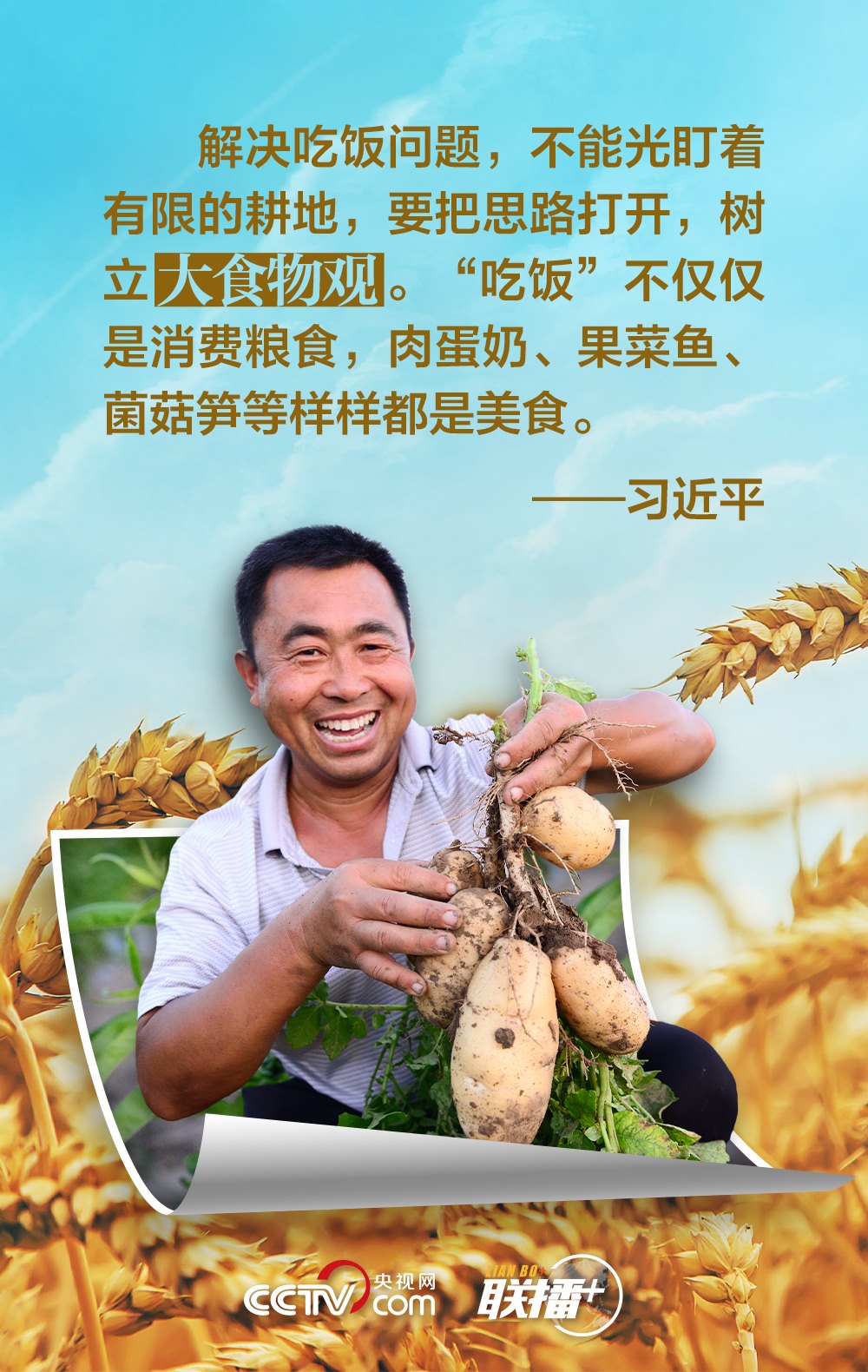 夏糧是全年糧食生產(chǎn)的第一季,約占我國(guó)全年糧食產(chǎn)量的五分之一,主要包括夏收的谷物、豆類和薯類等。“手中有糧,心中不慌。”習(xí)近平總書記十分重視糧食安全,他強(qiáng)調(diào),中國(guó)人的飯碗任何時(shí)候都要牢牢端在自己手中,飯碗主要裝中國(guó)糧。值此夏收時(shí)節(jié),央視網(wǎng)《聯(lián)播+》與您一起學(xué)習(xí)領(lǐng)悟總書記的糧食觀。