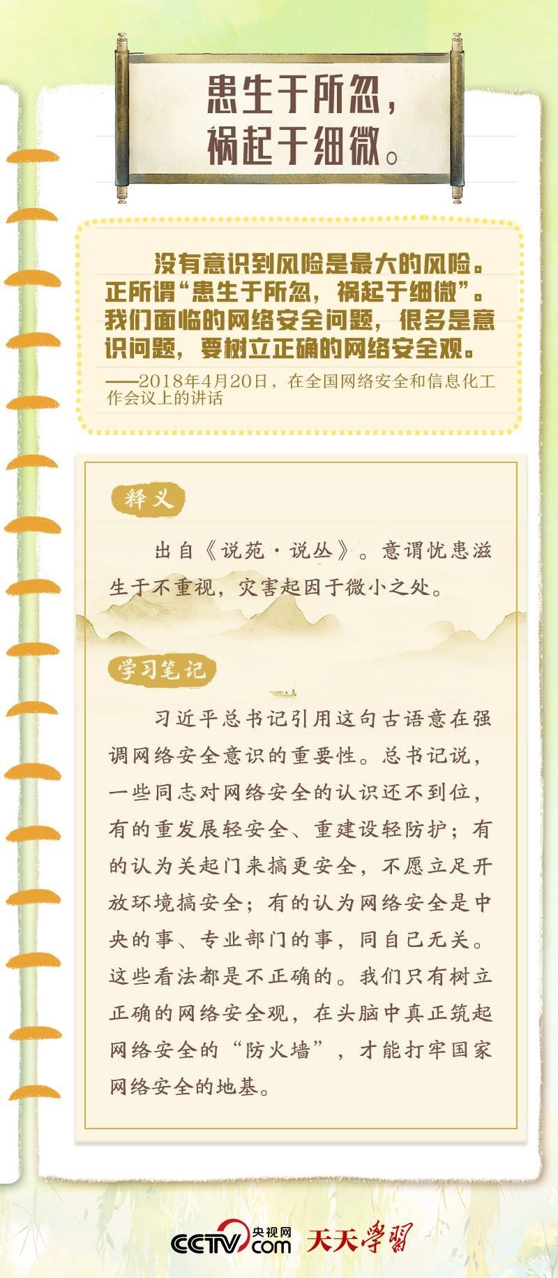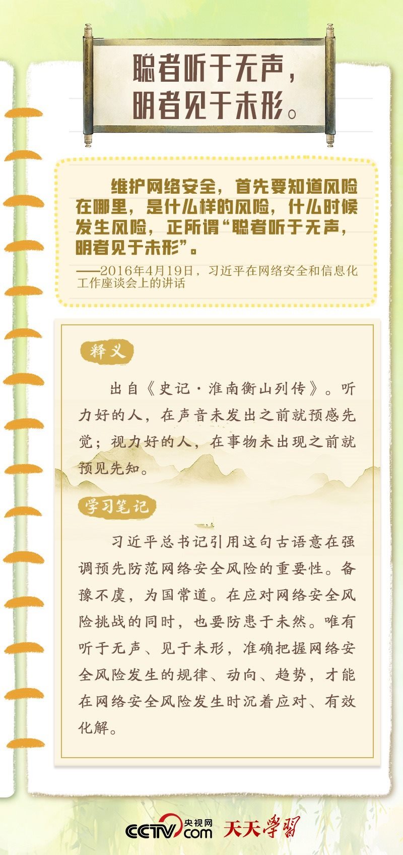 習(xí)近平總書記重視網(wǎng)絡(luò)安全工作,曾多次在講話中以典明理,深刻闡釋網(wǎng)絡(luò)安全工作的重要意義?!熬W(wǎng)絡(luò)安全宣傳周”到來(lái)之際,央視網(wǎng)《天天學(xué)習(xí)》特梳理總書記關(guān)于網(wǎng)絡(luò)安全的用典,與您一起學(xué)習(xí)領(lǐng)悟。