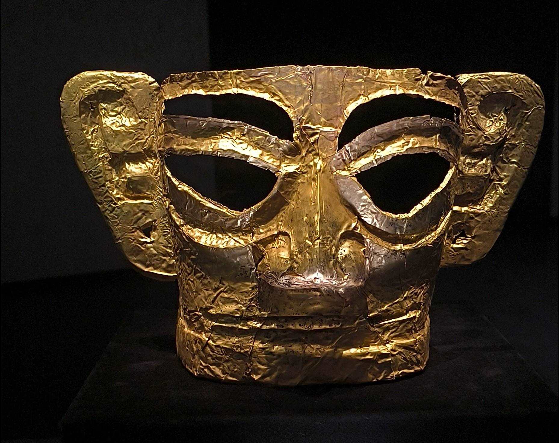 △三星堆博物館展出的金面罩。(總臺央視記者范凱拍攝)