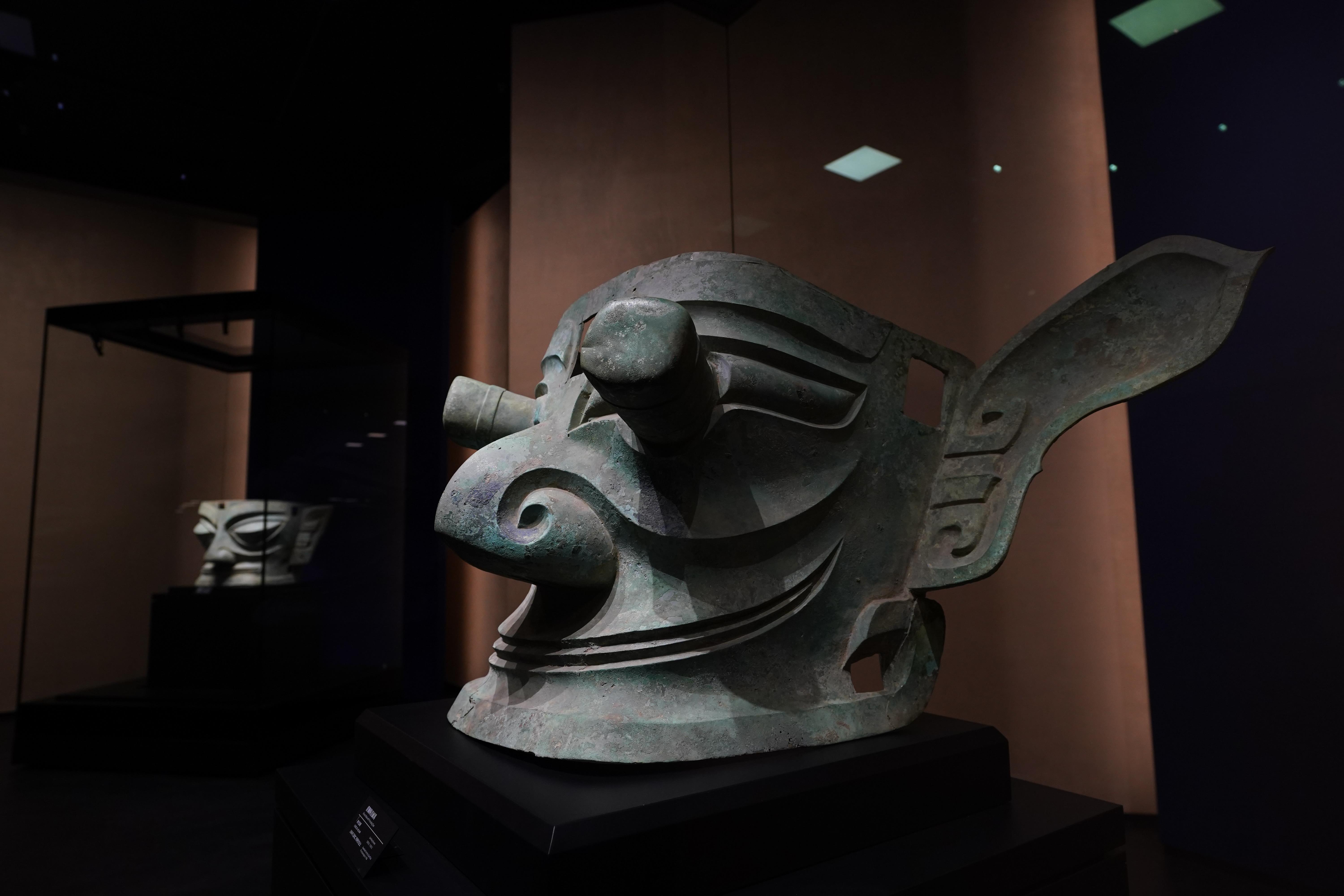 △三星堆博物館展出的青銅人頭像。(總臺央視記者范凱拍攝)