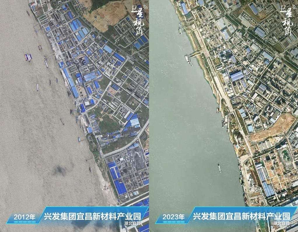 ↑2023年與2012年相比,興發(fā)集團(tuán)宜昌新材料產(chǎn)業(yè)園內(nèi),原來臨江建設(shè)的生產(chǎn)設(shè)施已經(jīng)搬遷和拆除。